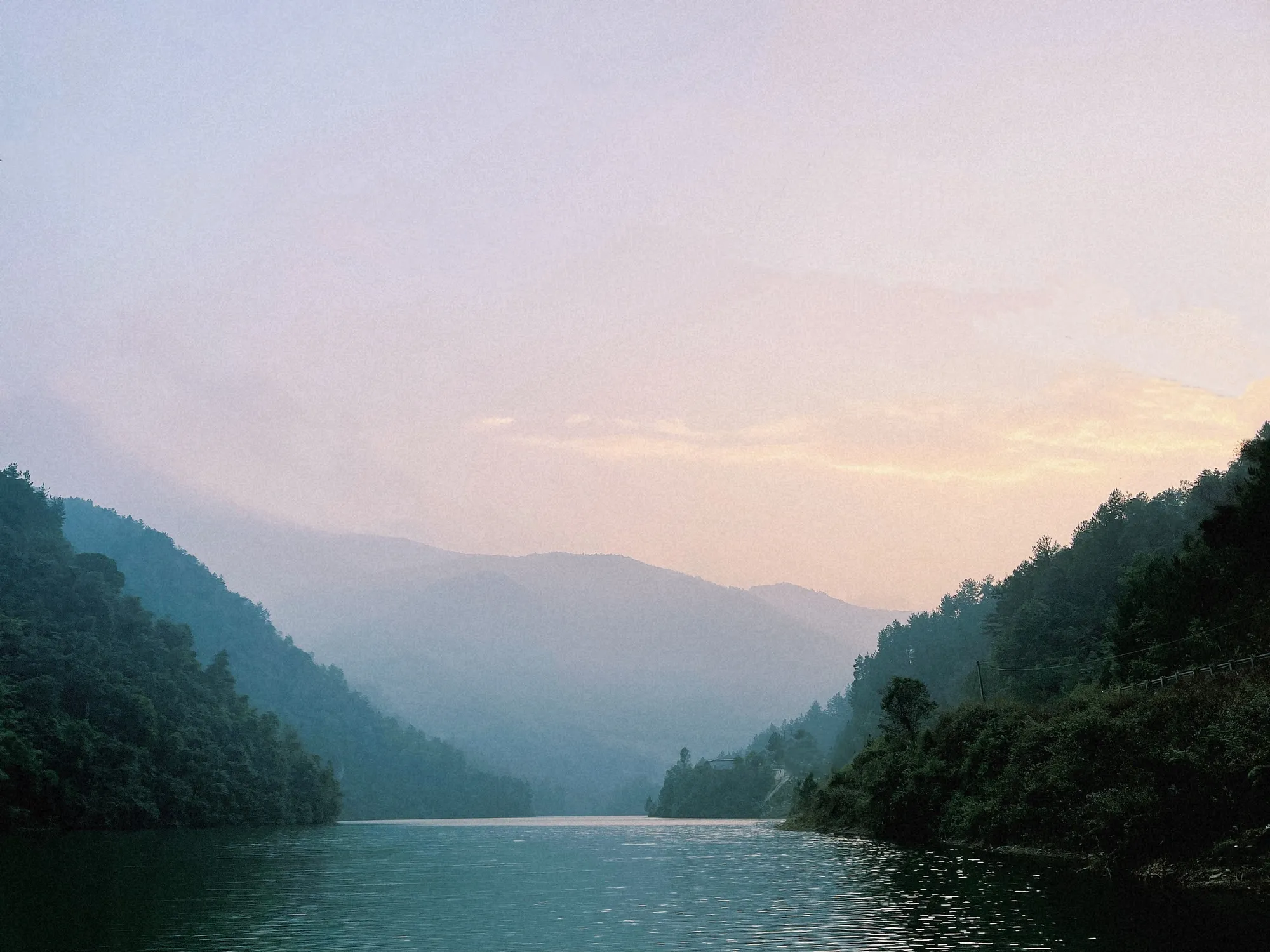 Chúng tôi bon bon trên chiếc xe thuê từ thị trấn, men theo đường đèo lên phía Bắc thị trấn vào cuối chiều. Hồ thuỷ điện Khao Mang hiện ra vào lúc hoàng hôn như một khoảng lặng dịu dàng của núi rừng. Mặt nước xanh biếc như phỉ thuý, phẳng lặng, miên man và sâu thẳm, phản chiếu ảnh sắc đậm nhạt của những dải núi chập chùng bao quanh. In trên mặt hồ xanh biếc trong veo là những lụa mây mờ mỏng tang, hồng rực ánh tà sắp tắt đang chậm rãi vùi mình vào những phiến đồi xa tít tắp. Mảng mảng mờ xa, lớp lớp gần rõ như một bức tranh thuỷ mặc đượm buồn. Những triền đồi nối tiếp nhau, nhạt dần trong làn sương tà du đãng, khiến ranh giới giữa thực và mộng trở nên mong manh đến lạ.